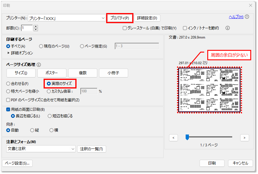 1)ページサイズ処理 『実際のサイズ』を選択。
